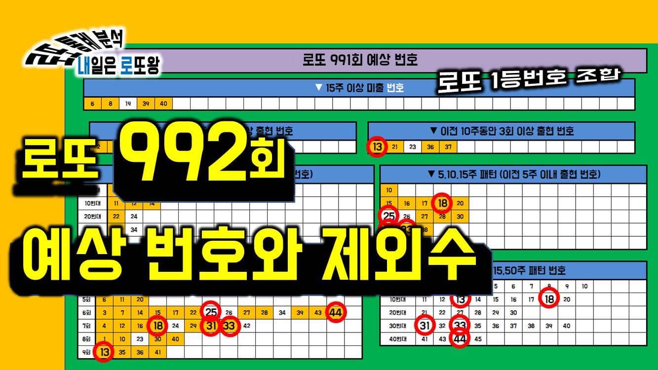 지난 991회차 당첨 번호는 13번, 18번, 25번, 31번, 33번, 44번 보너스번호는 38번으로 15주 이상 장기 미출 번호와 단번대가 빠져 있는 번호 조합으로 일반적인 번호 조합은 아니였음에도 1등에 당첨되신 분들은 축하드리며, 이번 992회차에서도 기대해 볼 수 있는 회차가 될 수 있기를 바라겠습니다.