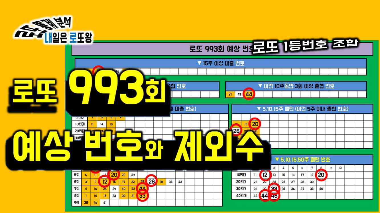 지난 992회차 당첨 번호는 12번, 20번, 26번, 33번, 44번, 45번 보너스 번호 24번으로 15주 이상 장기 미출수에서 1수, 쌍수 1쌍, 연번 1쌍과 단번대가 빠져있는 번호 조합으로 3주 연속 단번대가 빠져있는 번호 조합으로 1등의 주인공이 되신분들은 축하드리며, 이번 993회차에서도 내일은로또왕과 함께 기대해볼 수 있는 회차가 될 수 있기를 바라겠습니다.